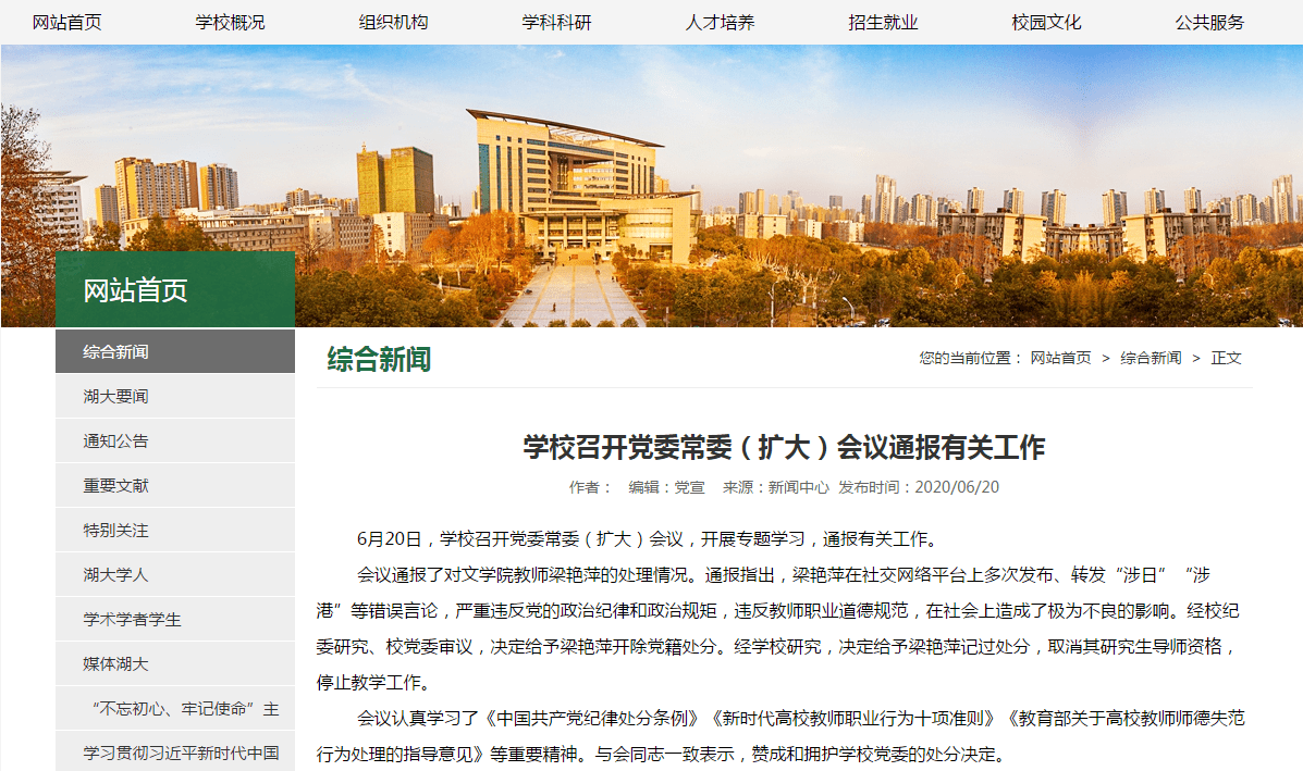 6月20日,学校召开党委常委(扩大)会议,开展专题学习,通报有关工作。 会议通报了对文学院教师梁艳萍的处理情况。通报指出,梁艳萍在社交网络平台上多次发布、转发“涉日”“涉港”等错误言论,严重违反党的政治纪律和政治规矩,违反教师职业道德规范,在社会上造成了极为不良的影响。经校纪委研究、校党委审议,决定给予梁艳萍开除党籍处分。经学校研究,决定给予梁艳萍记过处分,取消其研究生导师资格,停止教学工作。 会议认真学习了《中国共产党纪律处分条例》《新时代高校教师职业行为十项准则》《教育部关于高校教师师德失范行为处理的指导意见》等重要精神。与会同志一致表示,赞成和拥护学校党委的处分决定。