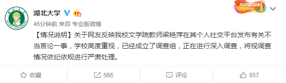 湖北大学官方微博4月26日晚发布情况说明,表示关于网友反映该校文学院教师梁艳萍在其个人社交平台发布有关不当言论一事,学校高度重视,已经成立了调查组,正在进行深入调查,将视调查情况依纪依规进行严肃处理。