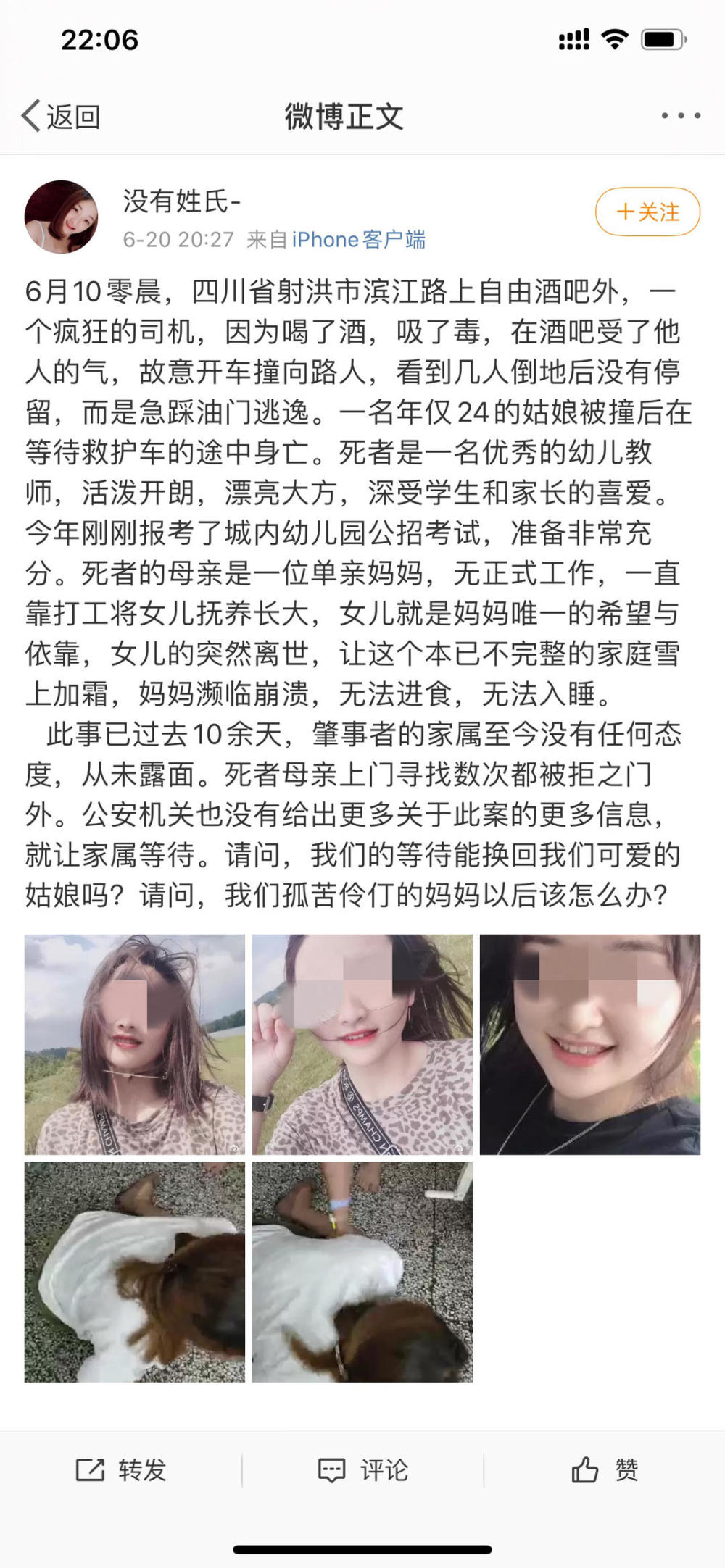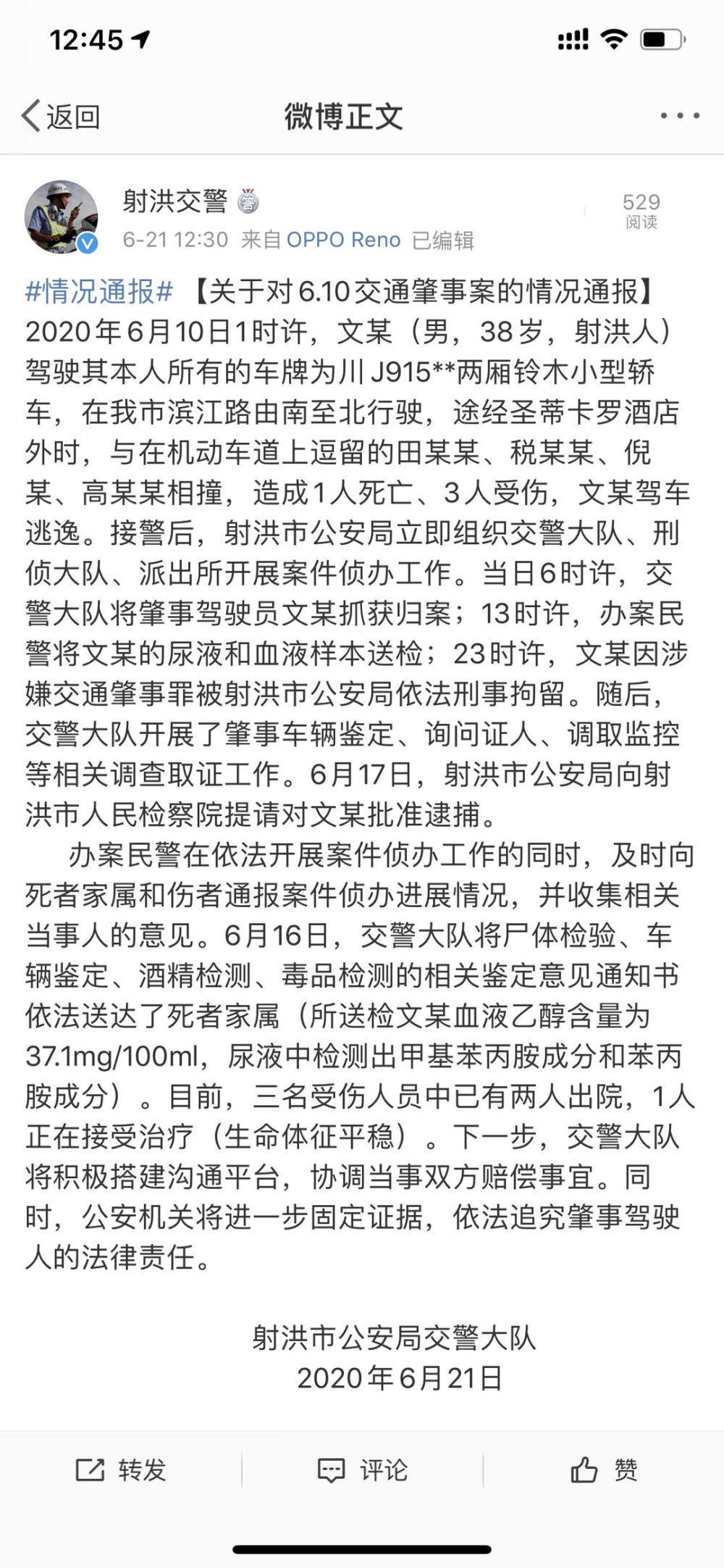 6月10日凌晨1点,四川遂宁射洪市发生一起交通事故。一辆小轿车在城区一酒店外,与路上行人相撞,造成1人死亡,3人受伤。事发后,肇事司机逃逸。 十天后,20日晚,死者家属网上发帖,称肇事者当晚吸毒、饮酒驾车,故意冲撞行人后逃逸。公安机关未给出明确答复,肇事者家属也从未露面。 21日,射洪警方发布通报称,肇事司机涉嫌酒驾肇事逃逸,已对检察院提请对司机文某批准逮捕。 死者家属:肇事者当晚吸毒酒驾故意冲撞行人 20日晚,死者母亲在网上发帖求助,称当晚肇事司机“因为喝了酒,吸了毒,在酒吧受了他人的气,故意开车撞向路人,看到几人倒地后没有停留,而是急踩油门逃逸。” 死者母亲表示,她是一名单亲妈妈,死者是一名24岁的幼儿教师,是她唯一的依靠。“此事已过去10余天,肇事者的家属至今没有任何态度,从未露面。”死者母亲称,公安机关没有给出更多关于此案的更多信息,只是让家属等待。 21日,针对家属反映的情况,射洪警方一一作出了回应。 封面新闻:肇事司机是否毒驾? 射洪警方:目前确认嫌疑人有吸毒史,通过对他的尿液进行检查,发现甲基苯丙胺成分和苯丙胺成分。初步判断嫌疑人几天前曾吸毒,但事发当天并未吸毒。 封面新闻:肇事司机是否酒驾? 射洪警方:嫌疑人1点肇事后逃逸,6点警方将其抓获。所送检血液乙醇含量为37.1mg/100ml,酒驾行为属实。 封面新闻:肇事司机是否故意开车撞向路人?有无监控? 射洪警方:现场有监控,通过目击证人与监控,发现嫌疑人在前往目的地途中,因为饮酒后驾车,在寻找目的地时,未能及时发现正在机动车道逗留的路人,不能及时处理紧急情况,造成事故发生。但并未发现嫌疑人有故意开车冲撞路人的行为。 射洪警方详细通报: 2020年6月10日1时许,文某(男,38岁,射洪人)驾驶其本人所有的车牌为川J915**两厢铃木小型轿车,在我市滨江路由南至北行驶,途经圣蒂卡罗酒店外时,与在机动车道上逗留的田某某、税某某、倪某、高某某相撞,造成1人死亡、3人受伤,文某驾车逃逸。接警后,射洪市公安局立即组织交警大队、刑侦大队、派出所开展案件侦办工作。当日6时许,交警大队将肇事驾驶员文某抓获归案;13时许,办案民警将文某的尿液和血液样本送检;23时许,文某因涉嫌交通肇事罪被射洪市公安局依法刑事拘留。随后,交警大队开展了肇事车辆鉴定、询问证人、调取监控等相关调查取证工作。6月17日,射洪市公安局向射洪市人民检察院提请对文某批准逮捕。 办案民警在依法开展案件侦办工作的同时,及时向死者家属和伤者通报案件侦办进展情况,并收集相关当事人的意见。6月16日,交警大队将尸体检验、车辆鉴定、酒精检测、毒品检测的相关鉴定意见通知书依法送达了死者家属(所送检文某血液乙醇含量为37.1mg/100ml,尿液中检测出甲基苯丙胺成分和苯丙胺成分)。目前,三名受伤人员中已有两人出院,1人正在接受治疗(生命体征平稳)。下一步,交警大队将积极搭建沟通平台,协调当事双方赔偿事宜。同时,公安机关将进一步固定证据,依法追究肇事驾驶人的法律责任。 免责声明:本文来自腾讯新闻客户端自媒体,不代表腾讯网的观点和立场。