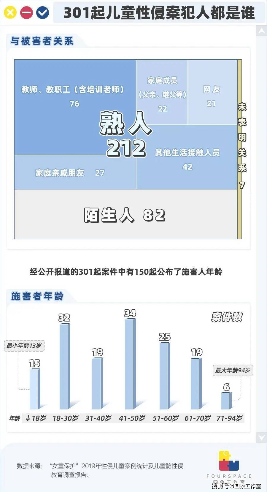 性侵害离孩子有多近?根据最高法院公开的数据,2017年审结的儿童猥亵案有2962起,2018年审结3567起,2019年仅上半年就审结1803起。在人民网的采访中,最高法工作人员表示当前当前奸淫幼女、猥亵儿童等性侵害儿童犯罪仍处于多发态势。 同时由于隐蔽性强,和各种主观客观原因影响,不排除有一定比例的案件尚未进入司法程序。著名犯罪心理学家、中国公安大学教授王大伟曾表示:性侵害案件尤其是针对中小学生的性侵害,隐案比例是1:7。 面对如此众多的性侵害案件,犯罪者的魔爪究竟离孩子们有多近? 女童保护基金(简称“女童保护”) 对媒体全年公开报道的性侵儿童(18岁以下)案例进行统计,根据2019年的数据:超7成案例属于熟人作案,且施害者呈现高龄化趋势,40岁以上占比59.33%,最大94岁。