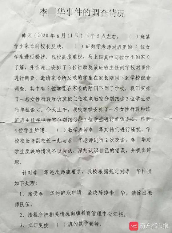 借指导题目去摸孩子屁股 本来是难以启齿的事,陈东和几名受害孩子的家长刚开始也打算将此事烂在肚子里。可经过几天的思索,还是决定将此事曝光。希望更多不敢出来指证的家长勇敢站出来,更希望教育部门重视起来,避免悲剧再次发生。 “事情不是最近才发生的,这个老师从三年级就教这个班。“陈东说,6月11日,自己女儿的一个同学因为受不住数学老师的猥亵,情绪崩溃了。下午3点多,那个崩溃的女同学哭着给她妈妈打电话说,由于她数学考了98分,当天中午,数学老师李某华把她叫到办公室说她这不对、那不对,还动手摸了她。 孩子的妈妈问她就还有没有其他的小朋友?孩子在跟他母亲描述的时候说,另外两个小朋友也有同样的遭遇。“这其中也就包括我们家女儿,那个女生的母亲后来联系到我老婆,讲了这个事。”陈东说,刚开始都不相信这个事,觉得可能是误会。 “直到那个女生的父母向我们描述了细节,我们才觉得事情严重了。”陈东说,那个孩子告诉他父母,老师是借指导题目去摸她的屁股、背,还有下面。孩子还反映有其他同学遇到过类似被骚扰的情况,于是这个家长就联系了其他同学的家长。当天下午,受害女生的父母就赶到东坑镇多凤小学向校方反映,并在家长群联系其他曾遭遇过老师黑手的学生家长。 主动报案的家长已有5名 “当天下午赶到学校举报的家长就有4名。”陈东说,家长向学校反映后,学校马上跟其中2位学生的家长了解,并在晚上安排了3位行政及该班班主任到学校对事件进行调查。考虑到保护小孩子的隐私问题,校长提出,家长不要对外声张。 “以前看到都是新闻,这事发生在自己身上,真是懵了,不知道怎么处理。”陈东说,有一个家长后来求助社工组织,社工帮他报了警。第二天,第五个受害孩子的家长也报警了,目前有报警的就是5个家长。东坑公安分局把那老师带走,直接就刑事拘留了。 陈东告诉南都记者,这个涉嫌猥亵儿童的老师是东莞本地人,40多岁,已经有近20年的教龄,之前在东坑几个学校教过书。事后,这些孩子向家长描述,从三年级上学期上学期开始,老师就有这个行为。目前报警的就有5个孩子,还不知道有没有其他人受到他猥亵,家长们希望这个老师受到严惩。 对于东坑镇多凤小学男老师猥亵女童的事,东坑警方表示,已经立案处理,案件在进一步侦查中,具体细节,不便透露。对于警方的处理,受害学生的家长表示,还是满意的,后面的事情就交给法律。但对于孩子的后续处理,家长们对学校和教育部门,还是很不满意。 家长希望转学避免再伤害 事情发生后,东坑镇教育部门曾组织了一次碰头会,表示会倾听家长诉求。陈东和几位受害学生的家长提出,盼教育主管部门为孩子办理转学事宜。