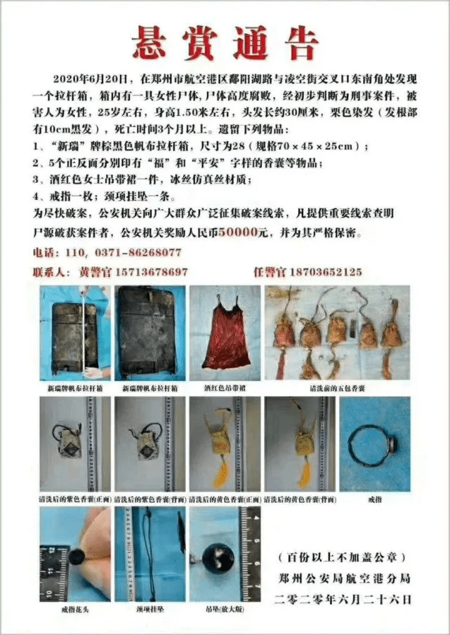 郑州警方发出的悬赏通告。截图 警方通告显示,6月20日,郑州市航空港区鄱阳湖路与凌空街交叉口东南角处发现一个“新瑞”牌棕黑色帆布拉杆箱,箱内有一具女性尸体,尸体高度腐败,经初步判断为刑事案件。被害人为女性,25岁左右,身高1.50米左右,头发长约30厘米,栗色染发(发根部有10厘米黑发),死亡时间3个月以上。 此外,通告还展示了拉杆箱内遗留的物品: 5个正反面分别印有“福”和“平安”字样的香囊,酒红色女士吊带裙一件,一枚戒指和一条颈项挂坠。 通告称,市民们若是见过上述物品,可向警方提供线索。凡提供重要线索查明尸源破获案件者,公安机关奖励人民币5万元,并为其严格保密。 28日晚,负责征集线索的一名民警表示,案件尚未侦破。