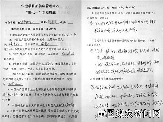 【本网讯】“七一”党的生日来临之际,为更加深入的了解党的光荣历史,重温中国共产党的光辉历程,进一步强化党员干部的党性修养,增强党性意识,促进党员干部弘扬党的优良传统和作风,6月30日,陕西铜川矿务局华远项目部供应管理中心组织全体党员开展了“迎七一”党史知识答题活动,通过回顾党的发展历程,加强党员的党史教育,向党的生日献礼。