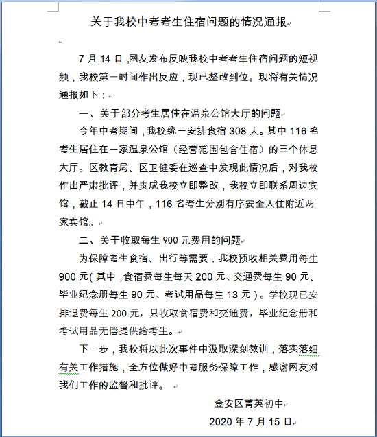 安徽网消息,7月15日上午,六安市金安区菁英初中发布一则情况通报,详细回复了网友关于该校中考考生住宿问题有关调查结果。 以下是情况通报内容: 7月14日,网友发布反映该校中考考生住宿问题的短视频,该校第一时间作出反应,现已整改到位。现将有关情况通报如下: 一、关于部分考生居住在温泉公馆大厅的问题 今年中考期间,该校统一安排食宿308人。其中116名考生居住在一家温泉公馆(经营范围包含住宿)的三个休息大厅。区教育局、区卫健委在巡查中发现此情况后,对该校作出严肃批评,并责成该校立即整改,该校立即联系周边宾馆,截止14日中午,116名考生分别有序安全入住附近两家宾馆。 二、关于收取每生900元费用的问题 为保障考生食宿、出行等需要,该校预收相关费用每生900元(其中,食宿费每生每天200元、交通费每生90元、毕业纪念册每生90元、考试用品每生13元)。学校现已安排退费每生200元,只收取食宿费和交通费,毕业纪念册和考试用品无偿提供给考生。 下一步,菁英初中将以此次事件中汲取深刻教训,落实落细有关工作措施,全方位做好中考服务保障工作,感谢网友对菁英初中工作的监督和批评。
