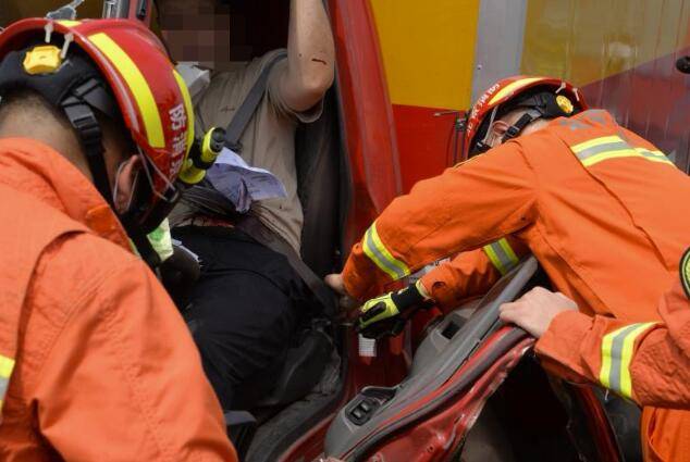 在现场999急救医生的指导下,现场指挥员迅速下达命令,成立警戒组、救援组。警戒组对事故现场周边进行警戒,救援组利用破拆工具对车辆进行破拆和扩张,指挥员在一边安抚被困者的情绪。 在救援过程中,被困司机面对救援人员一直在问“我会不会死?”,并不时在喊着疼。指战员们都会大声地回答:“你没事,坚持一下!医生也在现场,有我们在请放心!”
