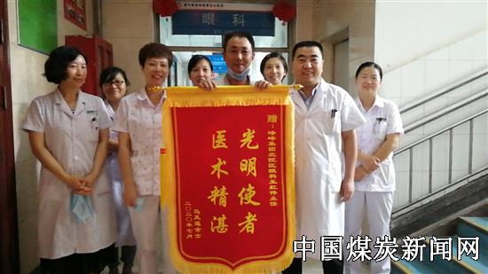 2020年7月15日早晨,在华北医疗峰峰总医院北院区眼科病房,白内障患者马某和家属将一面写有“光明使者,技术精湛”烫金大字的锦旗送给眼科主任王红伟及其团队手中,表达感谢和感激之情!马阿姨激动地握着王主任的手,动情的说:“健康扶贫政策就是好,谢谢王主任,谢谢所有的医护人员,谢谢你们让我重新见到了光明……”
