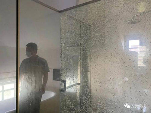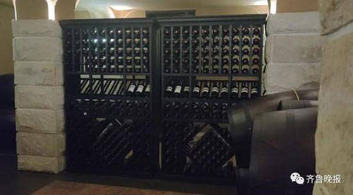 在楼上的一间浴室,一扇落地玻璃出现了爆裂的情况。在地下酒库,陆先生说酒柜里的酒也少了一些。甚至一张桌子上还出现了没喝完的酒,“也不知道是谁喝的。”
