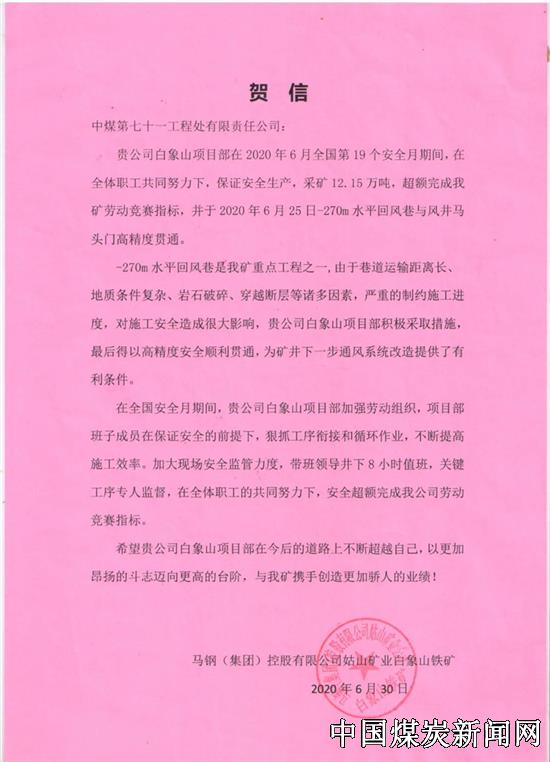 【本网讯】6月份,中煤七十一处白象山项目部月采矿12.15万吨,超额完成了矿方劳动竞赛指标,并于25日高精度贯通-270m水平回风巷与风井马头门,实现了安全和生产双丰收,喜获甲方贺信。