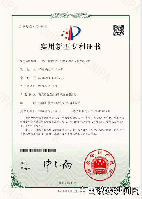 【本网讯】近日,由陕煤集团澄合矿业煤机公司申报的“一种矿用高强度圆环链连续热处理淬火液喷射圈装置(专利号:ZL 2019 2 1154524.0)科研项目取得国家知识产权局授权的实用新型专利证书。 ![]() ![]() 近年来,该公司通过不断完善科技创新管理机制,成立了圆环链与液压阀研究所,大力提高科技创新能力,持续加强国内前沿技术和煤炭制造行业适用技术攻关与研发,进一步优化了产品结构和核心技术,促进了科技成果向现实生产力的转化,使产品质量和综合性能得到了更好提高,拓宽产品市场范围和服务领域,增强了企业的技术实力和市场竞争力,成功铺就了一条科技兴企强企之路。截止目前,该公司已拥有2项国家发明专利、11项国家实用新型专利,仍有1项国家发明专利和1项国家实用新型专利通过申请并在受理中。
