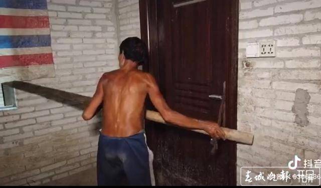 走出房间后,男子迅速把门关上,并用一根粗木棒从外面抵住。