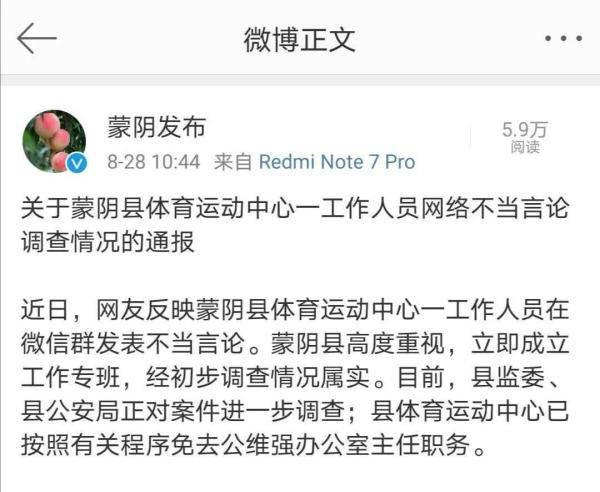 近日,网友反映蒙阴县体育运动中心一工作人员在微信群发表不当言论。蒙阴县高度重视,立即成立工作专班,经初步调查情况属实。目前,县监委、县公安局正对案件进一步调查;县体育运动中心已按照有关程序免去公维强办公室主任职务。