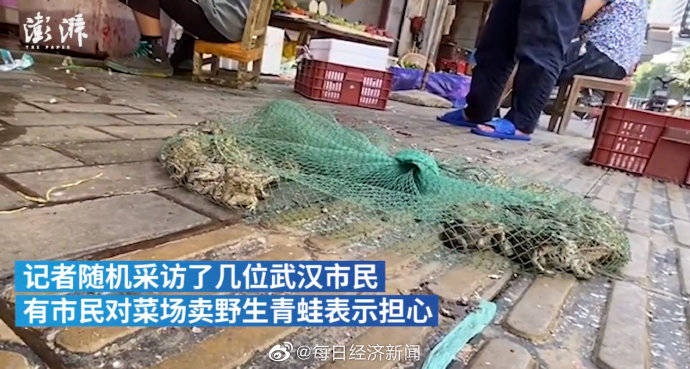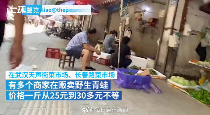 【武汉菜场卖野生青蛙每斤约30元,市监局称将调查】近日,湖北武汉。在天声街菜市场、长春路菜市场,有多个商家贩卖野生青蛙,价格一斤25元到30多元。市场监管局工作人员称,知情者可来电举报,将派工作人员去调查。(澎湃新闻,LS)