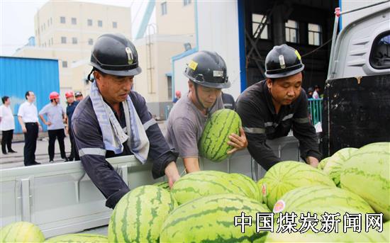 赵固二矿工会组织开展夏送清凉活动,为户外一线作业的职工送去西瓜、冰糕、清凉油等慰问物资,帮助他们安全度夏、清凉度夏。图为为副井口检修的职工送西瓜现场。