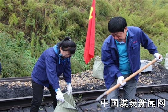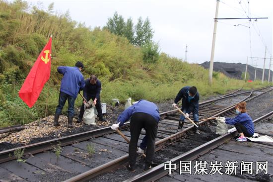 铁路沿线,党旗飘扬。铁选厂党员干部在鲜红党旗的照耀下,回首入党初心,把企业当成自己的小家,勤俭持家,一点点将铁路沿线两边上的煤清理成堆,然后装入袋中,用小推车拉到受煤坑入仓。经过党员干部一天的辛勤劳动,累计清理铁路沿线煤236袋,创收万余元。