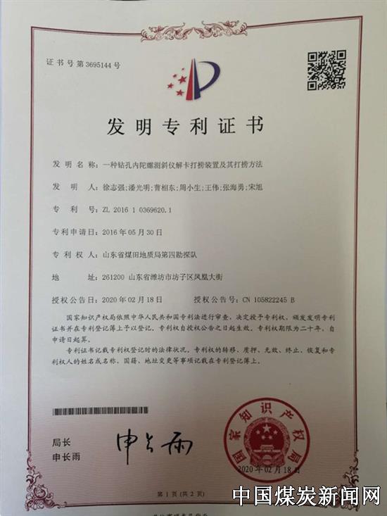| 山东省煤田地质局第四勘探队一项发明专利获省知识产权事业发展中心资助 | |||