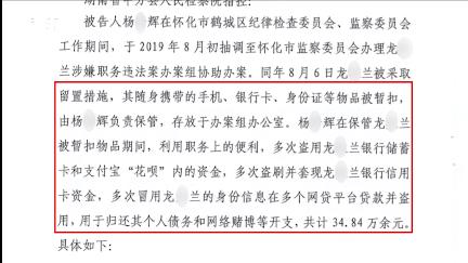 新晃的“操场埋尸案”以其血腥谋杀、地方关系网遮盖罪行著称,参与谋害的凶手都已被绳之以法,主凶被处以极刑,该案中负有责任的公职人员也都受到处分。龙某被留置160天,从纪委办案点回到家中,发现收到大量催债短信,杨某辉在龙家追问下坦白。龙某成了受害者,办案的纪委人员成了犯罪分子。 从法院的判决书看,杨某辉身为纪监委办案人员,所作所为可谓劣行斑斑。他利用职务之便,多次盗用龙某银行卡和支付宝“花呗”内资金,多次盗刷并套现龙某银行信用卡,多次冒用龙某的身份信息在多个网贷平台贷款并盗用,盗取的所有资金都用来偿还其个人债务和网络赌博。 这三个“多次”,证实杨某辉个人品行的卑劣,纪监委工作人员无需司法考试就能担任职务,行使留置、侦办等实权,杨某辉铤而走险沦为窃贼的事实表明,纪监委在把好人员素质关方面还可以做更多。除了办案人员素质,龙某资产成了杨某辉予取予夺的私产,更说明留置程序有很大漏洞,为知法犯法提供条件。 杨某辉已经被一审判刑,除了4年有期徒刑,还处罚金20万元,并被责令退赔龙某13万多。表面上看,这事已经有了结果,监守自盗的纪监委人员去坐牢,为贪污行为付出代价。但问题是,杨某辉拿龙某身份借的网贷还没还完,还有十多万窟窿没填上,这笔钱到底该由谁来还?