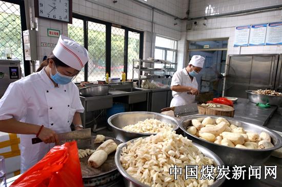 在食堂餐厅,我们看到食堂工作人员在紧张有序的忙碌着,有的在做面食、有人在准备今天的菜品、大厨老师在抡着炒锅,还有的对用具消毒,志愿者在帮忙摘菜等。
