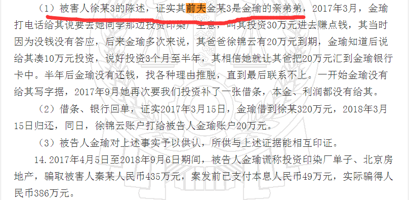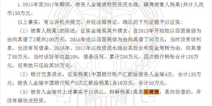 据其亲舅舅杨某1的陈述,金瑜系其外甥女,自2013年开始她以店面装修为由向其借了2笔共100万元,2015年也以店面装修为由向其借了50万元,当时没有谈利息,也没有写借条。2016年、2017年以投资流水线给其股份和资金周转为由,向其借了80万元,当时说好年收益10%,借条没写。累计230万元,四次银行转账合计138万元,后来她只还给其20万元。而金瑜却对上述事实予以供认,辩解杨某1是其亲舅舅,是向他借的,并没有骗他说投资。 此外,2017年3月15日,被告人金瑜谎称投资印染厂单子,骗得被害人徐某3人民币20万元。据被害人徐某3的陈述,其前夫金某3是金瑜的亲弟弟,2017年3月,金瑜打电话给其说要去她同学那边投资印染厂生意,叫其投资30万元进去赚点钱,其当时因为没钱没有答应,后来金瑜多次来说,其爸爸徐锦云有20万元到期,金瑜知道后说给其凑10万元投资,说好投资3个月至半年,其相信她就让其爸把20万元汇到金瑜银行卡中。半年后金瑜没有还钱,找各种理由推脱,直到最后联系不上。