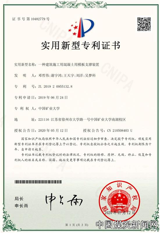 | 中国矿业大学:获一项国家实用新型专利证书 | |||