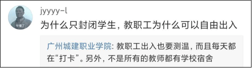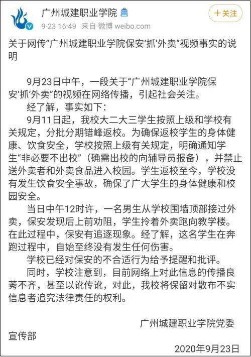 据悉,这段视频内容发生在广州城建职业学院。 “为确保返校学生的身体健康、饮食安全,学校按照上级有关规定,明确通知学生‘非必要不出校’(确需出校的向辅导员报备),并禁止送外卖者和外卖食品进入校园。” 同时,该校表示,这名学生在奔跑过程中,自始至终没有发生任何伤害,学校已经对保安的不合适行为给予提醒和批评。