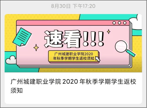 经检索,该公众号于8月30日发布了《广州城建职业学院2020年秋季学期学生返校须知》,上述截图内容来自于这篇推文。