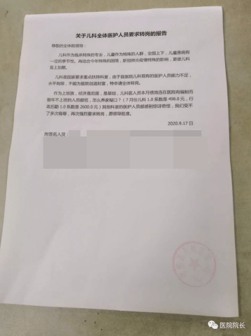 近日,网传一份安徽省安庆宿松县人民医院《关于儿科全体医护人员要求转岗的报告》(简称:《转岗报告》)显示,因7月绩效考核明显偏低,儿科部分医护人员联名向该院领导请求集体转岗,此事件引发关注。