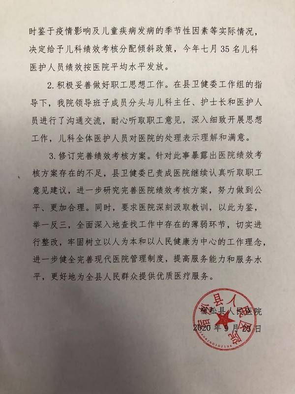 图说:联名申请转岗报告 来源:公众号“医学界” 针对此事,宿松县人民医院发布《情况说明》载明,根据医院绩效考核方案和平时考核结果,儿科医护人员以往实际发放绩效达到了全院临床科室平均水平。但2020年七月份,因儿科服务人数下降幅度较大,儿科医护人员绩效奖励与平时相比明显偏低,引起部分医护人员不满意,于9月17日书面向医院提交了要求转岗的报告并将该报告发布在医院职工微信群。对此,该院领导班子立即与儿科负责人及部分医护人员进行沟通,并召开专题会议进行了研究,形成了解决问题的初步意见。至此,问题已基本解决。现作出以下三项处理情况说明。 一是调整儿科绩效发放标准。该院领导班子重视职工诉求,进行了深刻反思。根据县卫健委工作组意见,同时鉴于疫情影响及儿童疾病发病的季节性因素等实际情况,决定给予儿科绩效考核分配倾斜政策,今年七月35名儿科医护人员绩效按医院平均水平发放。 二是妥善做好职工思想工作。在县卫健委工作组的指导下,该院领导班子成员分头与儿科主任、护士长和医护人员进行了沟通交流,听取职工意见,深开展思想工作,儿科全体医护人员对医院的处理表示理解和满意。 三是修订完善绩效考核方案。针对此事暴露出医院绩效考核方案存在的不足,县卫健委已责成医院继续听取职工意见建议,进一步研究完善医院绩效考核方案,努力做到公平、更加合理。同时,要求医院深刻汲取教训,以此为鉴,举一反三,全面深入地查找工作中存在的薄弱环节,切实进行整改。 宿松县人民医院官网显示,该院创建于1950年6月,是集医疗、预防、康复、保健、科研、教学于一体的二级甲等综合性医院,设有24个临床专业学科、9个医技专业学科。骨科、泌尿外科为省级重点特色专科。全院现有职工763人,其中卫生专业技术人员657人(高级职称64人,正高7人,中级职称173人),占职工总人数的88.5%以上。