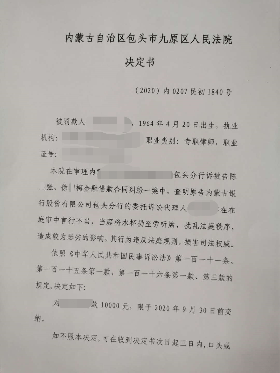 苗某茂支付1万元罚金的凭证。 作出处罚决定后,九原区法院对苗某茂的上述违规行为向包头市司法局发出司法建议,建议依法调查处理。 九原区法院办公室工作人员说,法院尊重和保证律师诉讼权利的同时,对个别漠视、违反法庭纪律的律师,将依照情节严重程度依法严肃处理。法官、检察官、律师等法律职业者同作为法律秩序的维护者、践行者和捍卫者,只有牢固树立崇法尚法的法治精神,恪守法律职业道德,才能行使好手中的权利,共建法治中国。