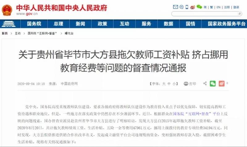 近日,有民众在国务院“互联网+督查”平台上反映拖欠教师工资补贴问题。经查,贵州省毕节市大方县自2015年起即拖欠教师工资补贴,截至2020年8月20日,共计拖欠教师绩效工资、生活补贴、五险一金等费用47961万元,挪用上级拨付的教育专项经费34194万元。 如此巨额的拖欠,不难推想当地教师的生活处境。值得注意的是,拖欠问题早就被反映过,并且得到过毕节市委办的回应。在人民网主办的领导留言板上,2015年1月30日,一名网友反映“大方县怎么老爱拖欠教师工资”:我是一名乡镇上的老师,快过年了,我们1月份的工资还没发,这一年的绩效没发,补贴没发,但是县城里的发了,把我们乡镇上的拖后啊?我想问一下这要到啥时候才发啊,辛苦一年就是等这些钱急用啊。