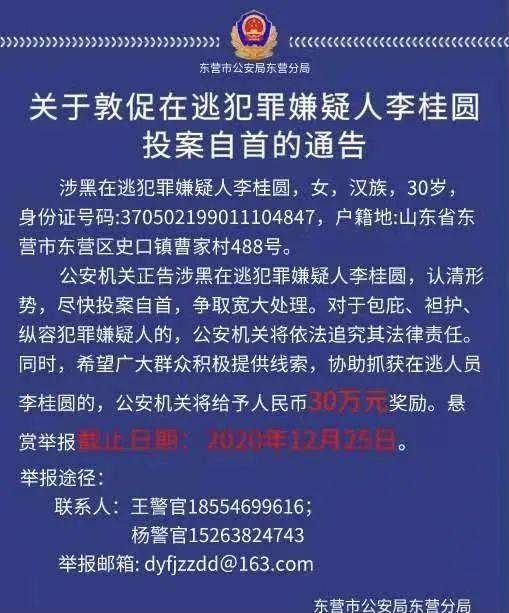 12月8日,一则山东省东营市东营区警方悬赏30万元通缉90后涉黑女头目李桂圆的消息在社交媒体流传。2016年10月至2018年3月期间,李桂圆通过开展汽车分期付款担保业务,以暴力、软暴力为催收手段,多次实施非法拘禁、寻衅滋事、敲诈勒索等违法犯罪行为。
