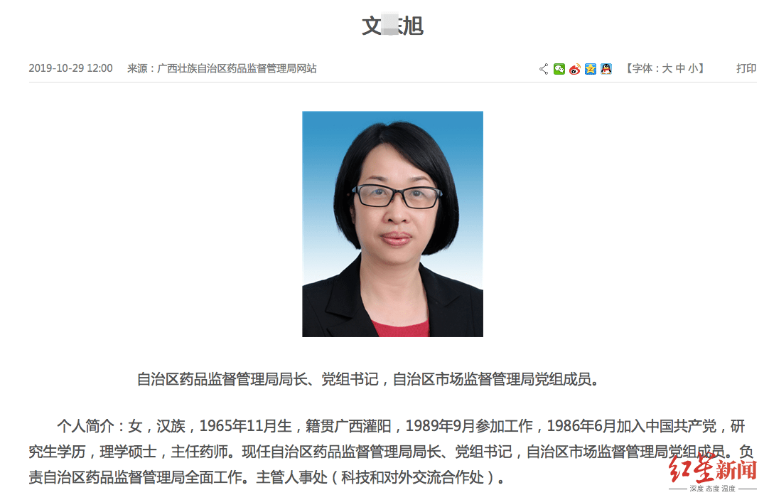 文某旭,图据广西壮族自治区药品监督管理局官网 广西自治区药品监督管理局负责宣传的工作人员告诉红星新闻,文某旭确实已经去世,“她属于厅级干部,应由上级或公安机关来发布,相信上级很快会有相关信息发布。”工作人员还称,目前该局的新局长尚未到任,“相信组织也会有考虑和安排。” 对网传早前纪委介入在查一说,前述工作人员表示:“不存在这种情况。” 美泉1612在南宁,是个相对不错的住宅小区,均价在1.8万到2万元,位于南宁市青秀区云景路29号。文某旭坠亡的美泉1612小区距离她所在单位——广西自治区药品监督管理局很近,横过马路对面即可到达,“从小区内步行走到单位,也不过5分钟。”当地知情人透露。 公开简历显示,文某旭,女,广西灌阳县人,出生于1965年11月,现年55岁,大学本科毕业于武汉大学化学系有机化学专业,理学学士。随后,其到上海深造,并获得研究生学历,属理学硕士,主任药师。2018年11月,其开始担任广西壮族自治区药品监督管理局党组书记、局长。 广西自治区药品监督管局是自治区市场监督管理局下属二级局,属副厅级单位。文某旭同时是广西自治区市场监督管理局的党组成员。 在广西自治区药品监督管理局的官网上,该局发布的政务活动报道显示,在2020年12月21日举行的广西食品药品安全新闻发布会上,文某旭还出席了此次会议。在此后的政务活动中,未见关于其出席活动的报道。