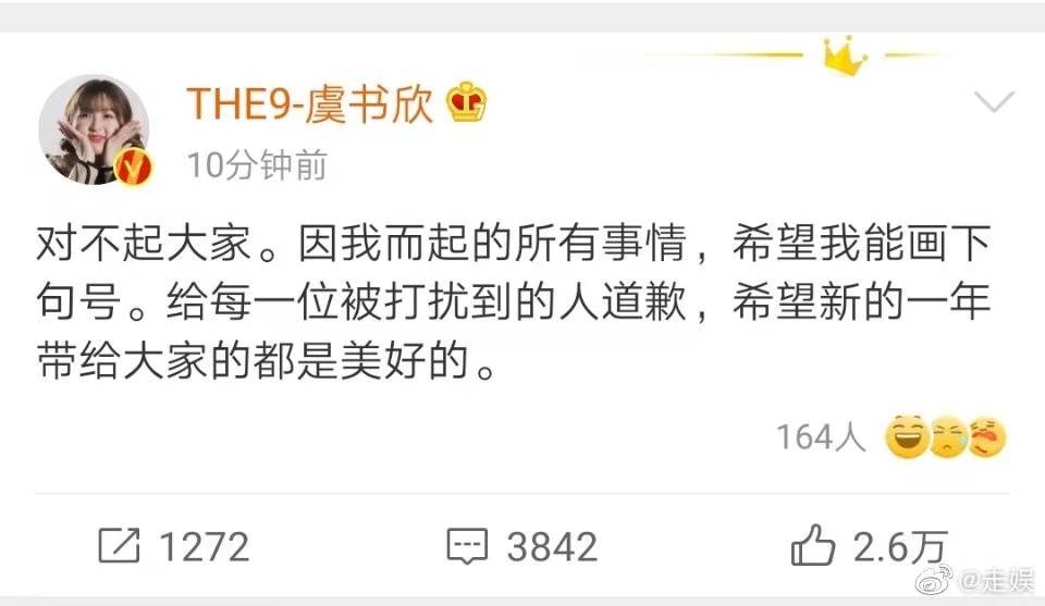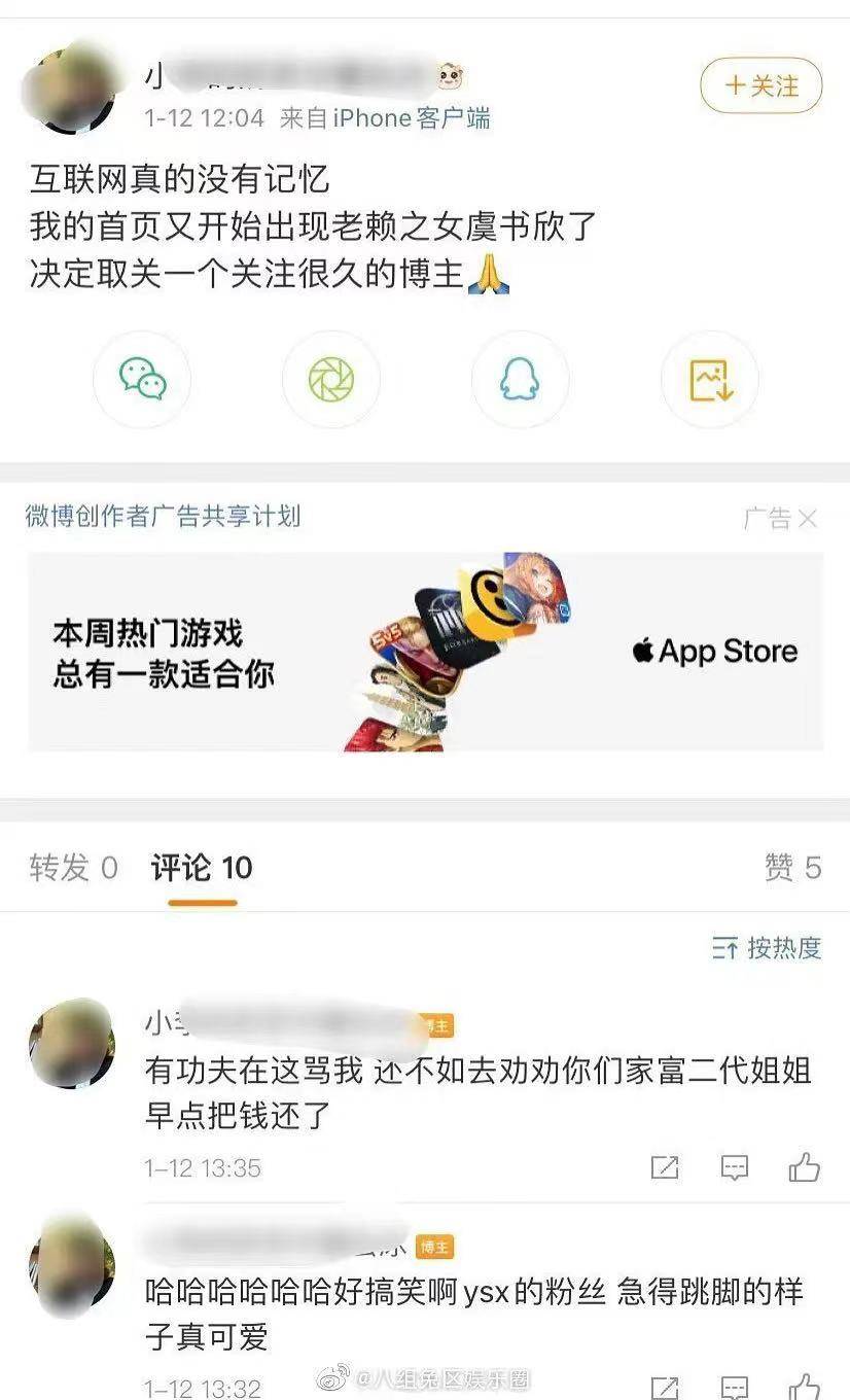 艺人虞书欣在其个人微博致歉。 来源:虞书欣个人认证微博 网传截图显示,12日,有微博网友在其个人微博发文称“互联网真的没有记忆,我的首页又开始出现老赖之女虞书欣了,决定取关一个关注很久的博主。”随后,该微博网友疑被“网暴”,有虞书欣的粉丝发微博称,该网友就读于中南财经政法大学,并威胁该网友称“24小时内,要看到你微博顶置道歉,为期一年。否则你们学校教务处会收到我的电话。”