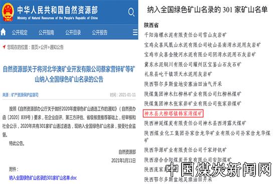 【本网讯】近日,国家自然资源部、陕西省自然资源厅分别发布了2020年新增国家级、省级绿色矿山名单,陕煤集团陕北矿业公司下属红柳林矿业公司、张家峁矿业公司、韩家湾煤炭公司、孙家岔龙华矿业公司4家煤矿成功纳入国家级绿色矿山名录库,涌鑫矿业公司安山煤矿入选省级绿色矿山创建库。至此,陕北矿业公司实现了生产矿井绿色矿山全覆盖。