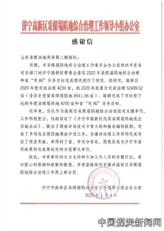 | 山东省煤田地质局第二勘探队收到济宁市高新区采煤塌陷地治理工作领导小组感谢信 | |||