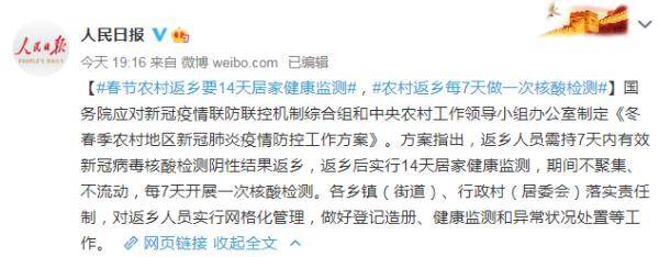 | 最新通知:春节农村返乡要14天居家健康监测!返乡人员如何划定?国家卫健委权威回应 | |||