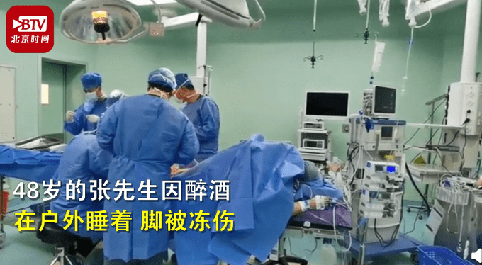 1月20日,辽宁沈阳。一48岁男子醉酒后,因门钥匙丢失进不去家门,在外睡着。第二天男子发现脚冻伤但没在意,隔几天又掉进冰窟窿里加剧伤势。到医院救治后,医生对其进行7天复温治疗,但10个脚趾发黑,不得不做了截趾手术。