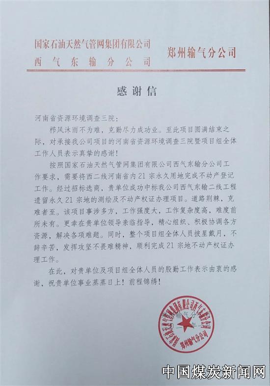 | 喜报! 河南省资源环境调查三院获国家石油天然气管网集团感谢信 | |||