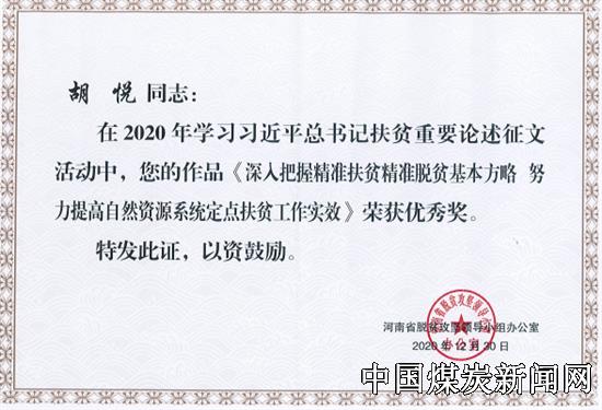 河南省资源环境调查三院胡悦荣获省扶贫办征文比赛优秀奖