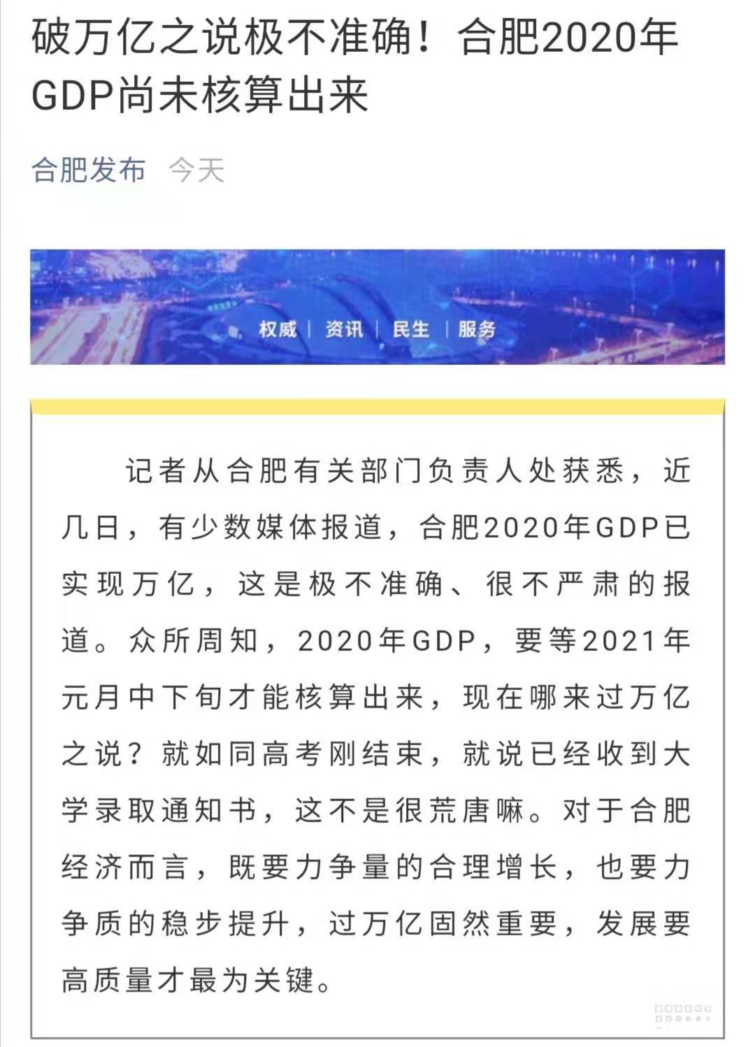 对于合肥成功跻身“GDP万亿城市俱乐部”的消息,合肥官方进行了回应。 1月2日晚,合肥市人民政府新闻办公室官方微信号“合肥发布”发文称,记者从合肥有关部门负责人处获悉,近几日,有少数媒体报道,合肥2020年GDP已实现万亿,这是极不准确、很不严肃的报道。 众所周知,2020年GDP,要等2021年元月中下旬才能核算出来,现在哪来过万亿之说?就如同高考刚结束,就说已经收到大学录取通知书,这不是很荒唐嘛。对于合肥经济而言,既要力争量的合理增长,也要力争质的稳步提升,过万亿固然重要,发展要高质量才最为关键。