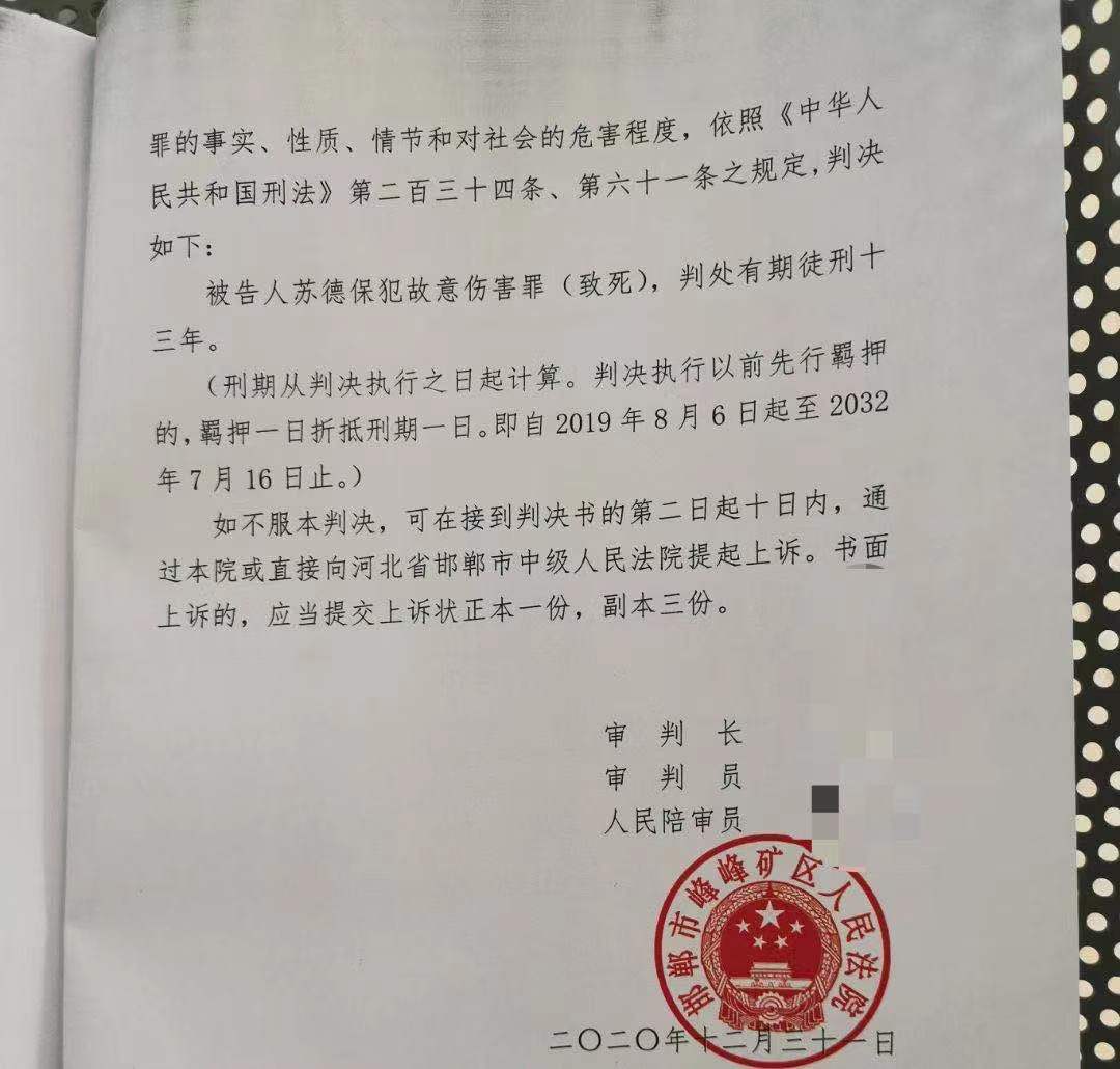 法院判决书。 被告人获刑13年 2020年9月29日,邯郸市峰峰矿区人民法院对此案进行公开审理,庭审结果未当庭宣判。 被害人的委托代理人张兴伟律师表示,本案应依法追究被告人故意杀人的刑事责任,对被告人苏德保应判处无期徒刑以上刑罚。苏德保的辩护人王艳涛律师则称,苏德保的行为虽然造成被害人韩某平死亡的后果,但是其行为没有社会危险性,不具有刑法上的可罚性,其行为是正当防卫,苏德保本人也认为自己是正当防卫。 据此,法院认为,本案属于是激情犯罪,韩某平和苏德保的纠纷没有达到非法剥夺他人生命的程度,苏德保对韩某平的主观不是故意杀人,故对被害人代理人的意见本院不予采纳。在本案的第一现场,虽然韩某平持射钉改装枪来到苏德保养鸡场门口,但其将枪藏于围墙外,并没有显露枪支,苏德保也并不知道韩某平持射钉改装枪来找他,彼时苏德保并没有受到现实不法侵害,不符合正当防卫的条件,其对韩某平的攻击具有故意伤害的故意。在第二现场中,苏德保将韩某平的枪打掉后,此时对苏德保的人身威胁已不存在,但是苏德保仍继续持铁锹击打已躺倒在地的韩某平,且打击部位主要集中于头部,足见其伤害他人身体的故意,故对该辩护意见不予采纳。 1月5日,案件在峰峰矿区人民法院进行一审宣判,法院认定被告人苏德保犯故意伤害罪(致死),判处有期徒刑十三年。 苏德保的辩护律师殷清利称,从防卫意图上看,被告人苏德保出于本能反应,在被害人韩某平曾明确告知其持射钉改装枪且击发致使西养鸡场遗留有枪洞的紧迫形势下,被告人苏德保主动实施肢体控制、意欲扭送并交公安机关处理,并对持射钉改装枪伏击的被害人实施防卫,均是为了保护本人及他人的合法权益而实施;从防卫限度看,本案属于特殊防卫,不受限度要求,另外本案中对方虽然死亡,但被告人系重伤二级,伤情相对比,明显不超过必要限度,并不存在防卫过当。