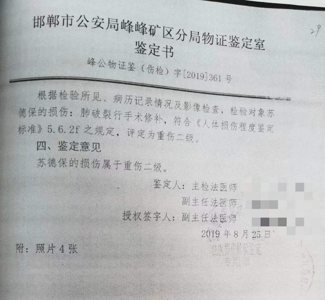 苏德保伤情鉴定报告。 养鸡场老板反杀持射钉改装枪上门男子 苏德保妹妹告诉新京报记者,韩某平此前是养鸡场的一名员工,韩某平因怀疑在养鸡场吃坏东西“食物中毒”,与哥哥苏德保发生纠纷。 河北省邯郸市峰峰矿区人民法院一审判决书显示,2019年6月29日凌晨,被害人韩某平持射钉改装枪来到苏德保经营的养鸡场,将枪支藏匿在养鸡场北大门外,随后在大门外喊醒苏德保,苏德保隔着铁栅栏门与韩某平对话,其间苏德保妻子在屋内报警并通知苏德保妹妹及邻居前来。当苏德保妹妹和妹夫开车即将赶到时,苏德保跑到铁栅栏门处抓住韩某平的衣领并打韩某平一拳,随后又拿起一根木板朝蹲在地上的韩某平打去。 此时,韩某平拿起事先藏匿的射钉改装枪朝苏德保打了一枪,苏德保被击伤,韩某平持射钉改装枪沿小路离开。苏德保让妹夫开车拦截,并让邻居拿出一把铁锹。找到韩某平后,韩某平持射钉改装枪指着苏德保,苏德保持铁锹冲到韩某平跟前打掉韩某平手中的枪,继续朝韩某平的头部殴打,韩某平被打倒在地后,苏德保在邻居等人的劝阻下停止殴打,苏德保被送医治疗,当日韩某平因抢救无效死亡。