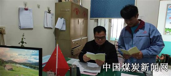 10月19日,安徽淮北桃园矿保运区两名职工在单位讨论《红线》学习情况及巧记方法。
