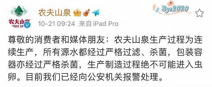 10月21日,@农夫山泉 就网传“未开封农夫山泉瓶装水现大量蛆虫”一事发表回应称,公司生产过程为连续生产,所有源水都经过严格过滤、杀菌,包装容器亦经过严格杀菌,生产制造过程绝不可能进入虫卵。目前公司已经向公安机关报警处理。 据@时间视频 20日报道,一女子反映其购买的农夫山泉瓶装矿泉水里有大量蛆虫。当事女子表示,矿泉水均未开封,农夫山泉已派质检人员去检测。