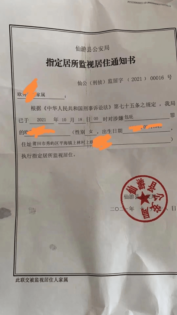 近日,福建莆田欧某中因建房纠纷砍死邻居一案引发社会各界关注。日前,网上流传一张福建省莆田市仙游县公安局开具的对于欧某中妻子执行指定居所监视居住的通知书,上面书写:根据《中华人民共和国刑事诉讼法》第七十五条规定,仙游县公安局已于2021年10月18日零时对涉嫌包庇罪的欧某中妻子欧某香执行指定居所监视居住。 对于欧某中妻子欧某香是否涉嫌包庇罪一事,记者电话联系了莆田市仙游县公安局,公安局电话一直无人接听,随后记者又电话联系了莆田市公安局,公安局工作人员表示对于此事并未听说且不知情。