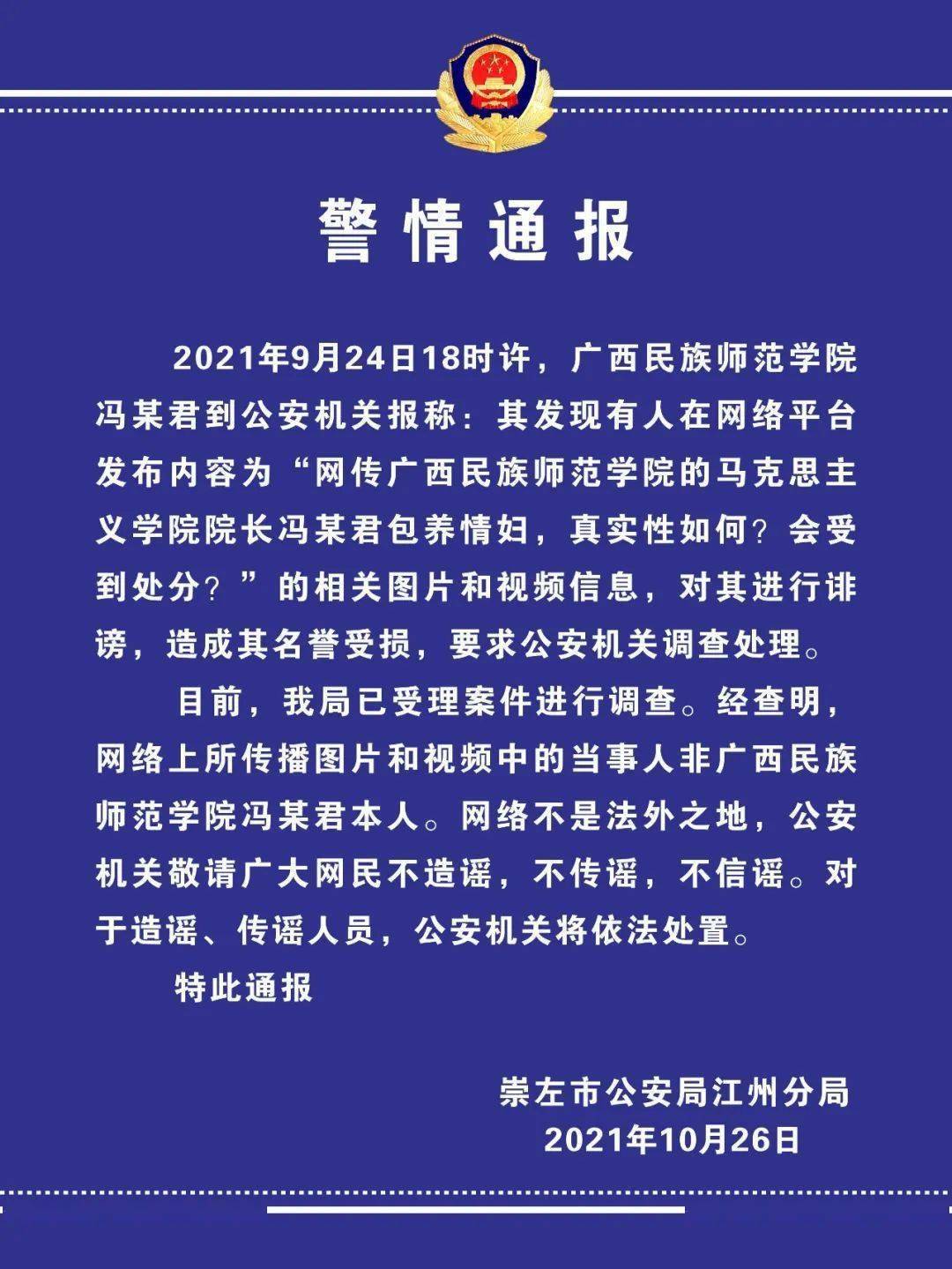 崇左市公安局江州分局10月26日发布警情通报称,2021年9月24日18时许,广西民族师范学院冯某君到公安机关报称:其发现有人在网络平台发布内容为“网传广西民族师范学院的马克思主义学院院长冯某君包养情妇,真实性如何?会受到处分?”的相关图片和视频信息,对其进行诽谤,造成其名誉受损,要求公安机关调查处理。 目前,我局已受理案件进行调查。经查明,网络上所传播图片和视频中的当事人非广西民族师范学院冯某君本人。网络不是法外之地,公安机关敬请广大网民不造谣,不传谣,不信谣。对于造谣、传谣人员,公安机关将依法处置。