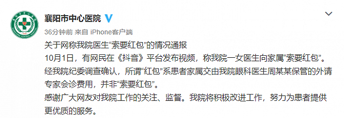 | 湖北襄阳一医生被指索要红包?医院通报 | |||