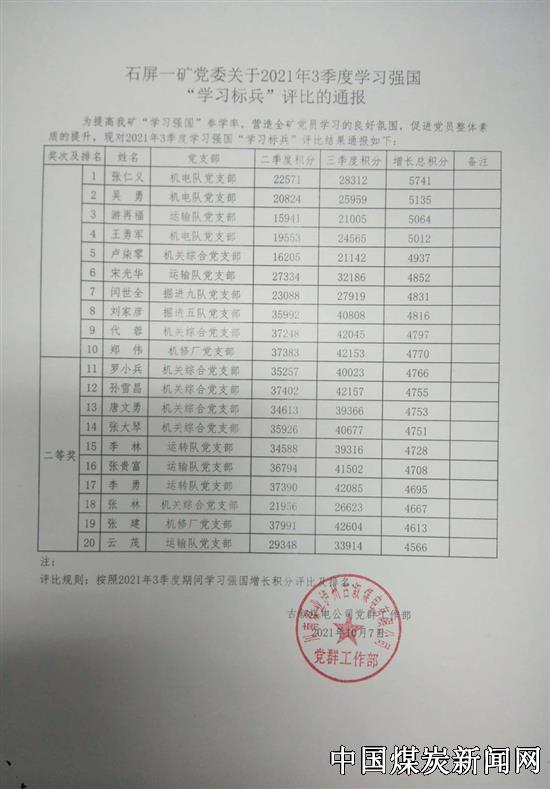 | 古叙煤田公司石屏一矿表扬三季度学习强国“学习标兵” | |||