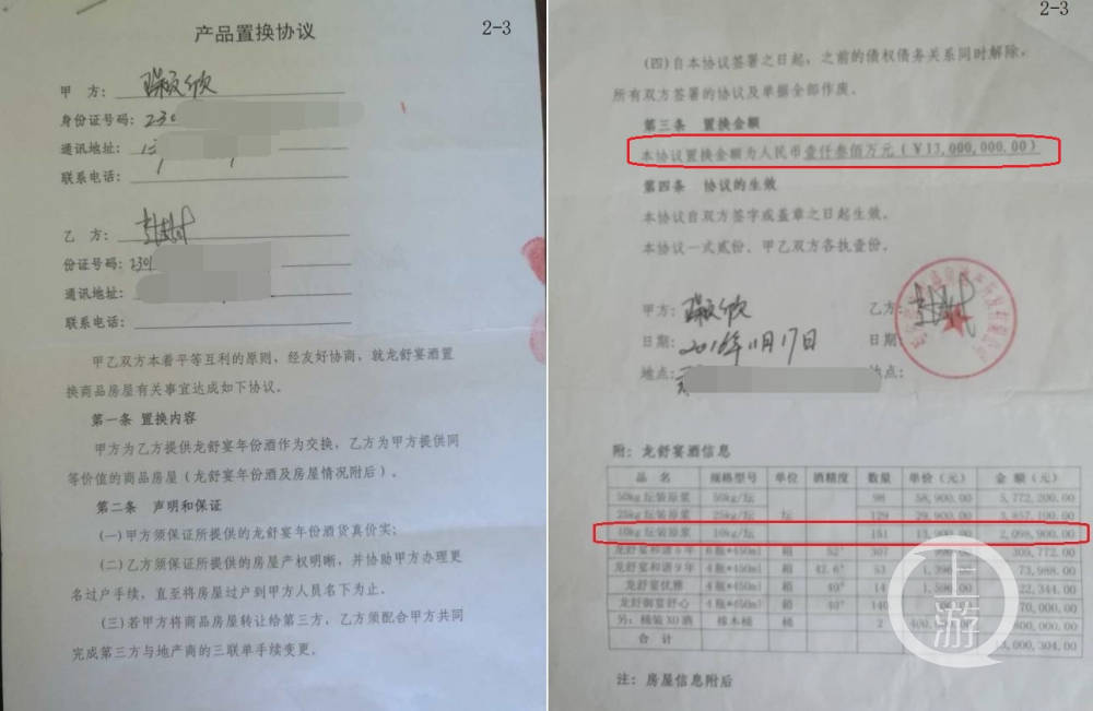 副局长情人用151坛廉价白酒强换1300万房产 尽管重获自由,但是赵树斌的日子仍不好过。 赵树斌称,自己被释放后,束玮的情人王颖欣多次“敲打”自己,称束玮会将他再次羁押,强迫他以价值1300万元的房产,换购一批白酒。赵树斌不愿意换,又不敢明说,只好躲着她,经常故意将手机关机。 赵树斌的物业公司员工韩霜称,王颖欣因为找不到赵树斌,就给她打电话,“电话里说怎么人放出来还得瑟了,是不是还想再进去,让他赶紧给我回电话,就说束玮找他有事!” 韩霜称,后来从赵树斌那里听说,王颖欣要赵树斌用价值1300万的房产换她的白酒,这个数目吓了韩霜一跳。 9月28日,赵树斌对记者说:“因为之前被羁押过37天,王颖欣暗示我的取保候审掌握在束玮手上,这对我形成了巨大的心理压力,几乎夜夜难眠。”据称,当时其他负责经侦的人员曾劝赵树斌说:“你不能得罪他,买这批酒对你有好处。”在这种心理压力下,赵树斌最终被迫同意了这桩显失公平的交易。 为体现这桩交易的“合法性”,王颖欣和赵树斌签订了产品置换协议。记者看到这份协议中写到,“甲方(王颖欣)为乙方(赵树斌)提供龙舒宴年份酒作为交换,乙方为甲方提供同等价值的商品房屋”,置换金额为一千三百万元。协议附件中列明了酒的数量和规格,以及房屋的坐落和面积。其中“10kg坛装原浆”龙舒宴酒列明的价格是每坛13900元,151坛共计2098900元,折合每斤695元。 赵树斌表示,在实际履行时,双方并未按照约定数量执行,他未从王颖欣处拉走全部酒。 ▲王颖欣和赵树斌签订的产品置换协议,置换金额为1300万元。图片来源/受访者提供