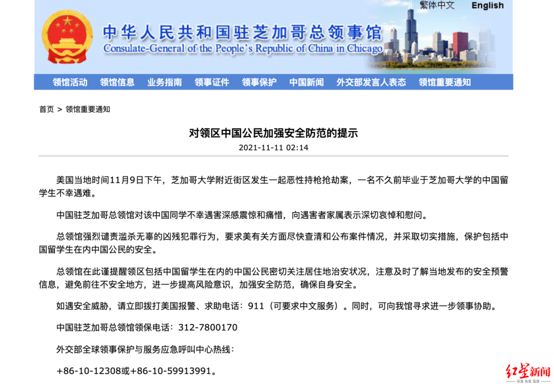 郑的朋友尼克·杰克逊接受外媒采访 据芝加哥枪支暴力统计数据表明,截至 11 月 8 日,发生在该社区的枪击事件比 2020 年增加了两倍多,从去年的 5 起增加到今年的16 起。 中国驻芝加哥总领馆对郑同学不幸遇害深感震惊和痛惜,向遇害者家属表示深切哀悼和慰问。总领馆强烈谴责滥杀无辜的凶残犯罪行为,要求美有关方面尽快查清和公布案件情况,并采取切实措施,保护包括中国留学生在内中国公民的安全。