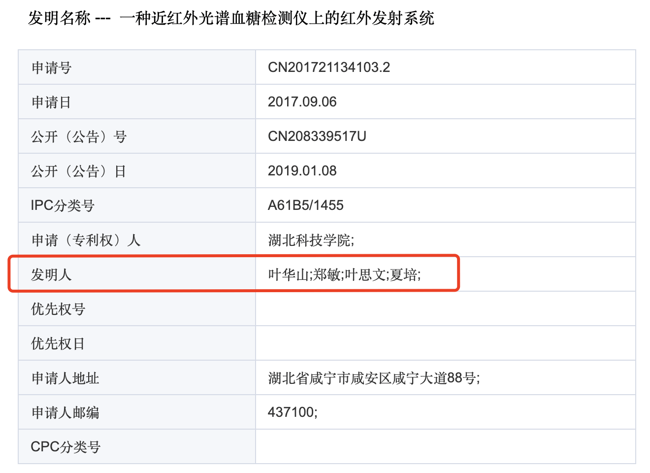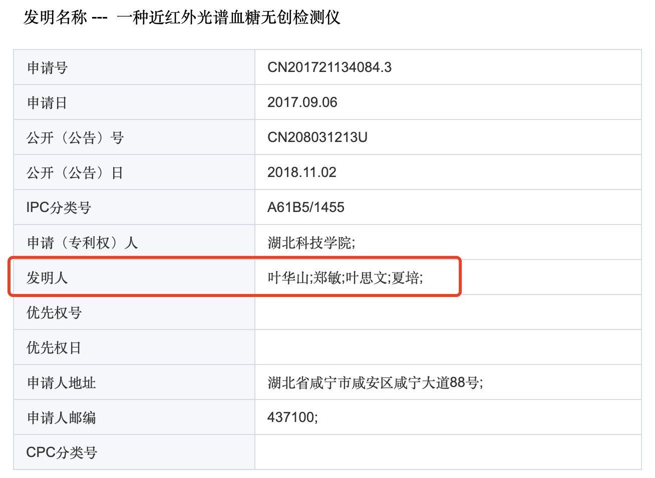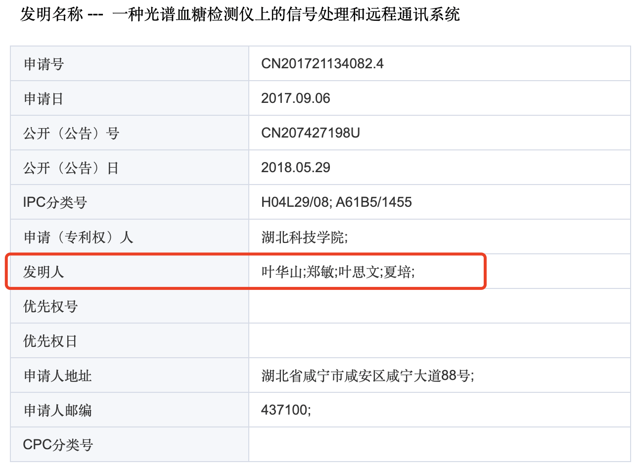 在近500人的校友群里,孟玉朋被踢出了微信群聊,这源于一起针对母校老师的举报。 “我2015年大学本科毕业,向学校提交了毕业设计作品和论文。没想到的是,今年我发现学校的老师在2017年剽窃了我的学术成果,并且申报了三项专利。”日前,湖北科技学院2015届生物医学工程专业毕业生孟玉朋向澎湃新闻表示。 这三项专利的第一、第二申报发明人分别是湖北科技学院医学部生物医学工程与医学影像学院副教授叶华山以及该学院院长郑敏。11月9日,湖北科技学院认定叶华山存在剽窃他人学术成果和不当使用他人署名的学术不端行为,对叶华山暂缓2年申报高一级专业技术职务岗位,并取消其3年内研究生导师的申报资格。 孟玉朋对该处理结果不满,他认为也应该追究专利第二申报发明人郑敏的责任。对此,郑敏向澎湃新闻回应表示,她从专利申请到获批再到批下来的全部过程,并不知情,也是受害者。 双方各执一词,澎湃新闻就此事联系湖北科技学院党委宣传部,相关负责人回应表示,“学校已有统一的处理结果,以上报的文件为准。” 校方认定涉事教师剽窃他人学术成果 事件还要追溯到2015年,据孟玉朋陈述,当年临近毕业期,他在一家企业实习,设计了一款血糖无创检测仪。同年5月,他带着毕业设计作品和论文《基于ATR-FTIR光谱的人体血糖远程无创检测系统设计》,参加湖北科技学院本科毕业论文答辩。 直至今年,他所创办的公司申请高新技术企业,自己才意外发现研究成果被他人剽窃用来申报了3个专利。国家知识产权局专利检索及分析官网显示,专利的申请时间是2017年9月6日,申请(专利权)人为湖北科技学院,发明人为:叶华山、郑敏、叶思文、夏培。 而前两位“发明人”正是母校的老师。叶华山现为湖北科技学院医学部生物医学工程与医学影像学院副教授,郑敏则为该学院的院长。 另外,孟玉朋透露,叶思文是叶华山的侄女,夏培是叶华山的外甥。澎湃新闻从湖北科技学院的知情人士处证实,叶思文和夏培确实与叶华山存在亲戚关系,且为湖北科技学院的往届生。